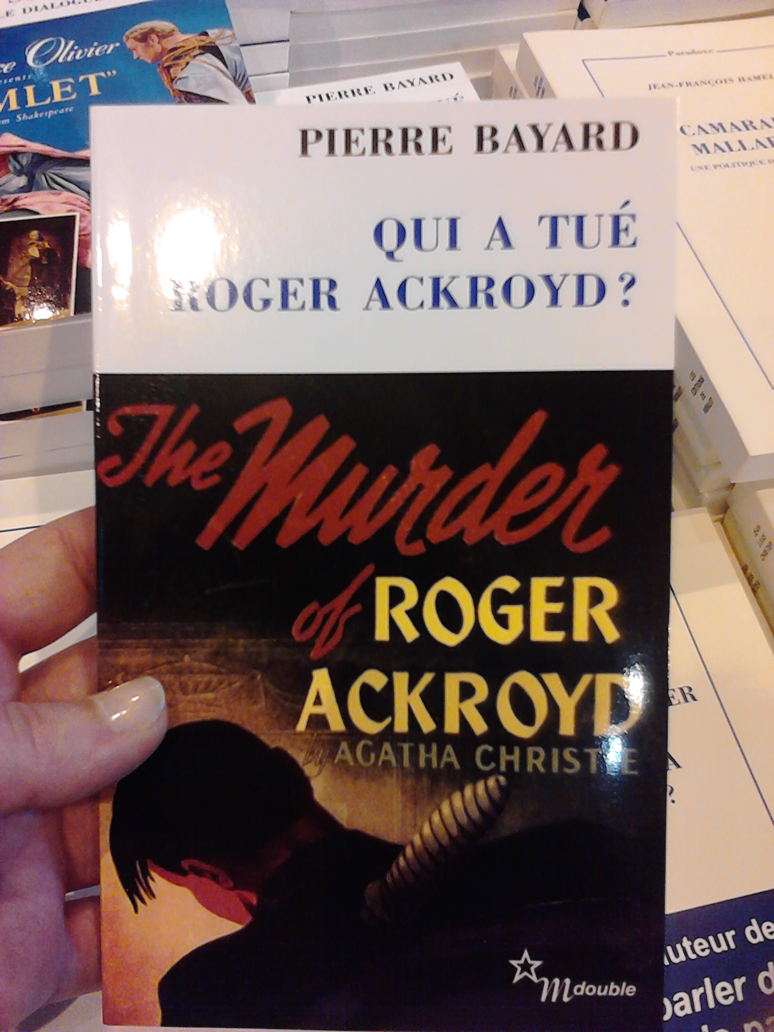 livres intéressants, entre autre les œuvres de Pierre Bayard. J’ai très envie de lire Qui a tué Roger Ackroyd ?, un roman qui reprend l’intrigue du brillant roman d’Agatha Christie. L’idée de l’auteur, c’est que l’auteure s’est malheureusement trompée dans la résolution de l’histoire. En fait, le coupable court toujours entre les pages du livre, et il va falloir le débusquer en pénétrant à l’intérieur du roman. Pierre Bayard a écrit plusieurs livres sur le même principe, en se basant notamment sur Le Chien des Baskerville.