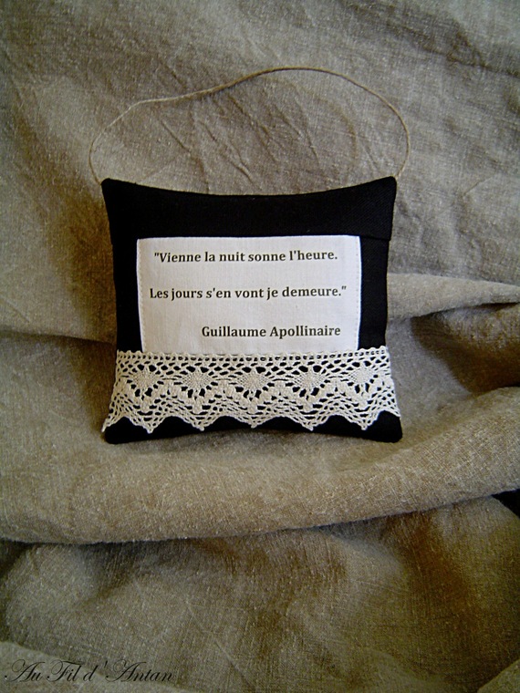 Également sur le site alittlemarket, j’ai trouvé une boutique qui propose d’adorables petitscoussin-citation coussins, intitulés « coussins de porte ». On les accroche sur la poignée de porte de la chambre ou de la bibliothèque, et le vendeur propose plusieurs modèles avec des citations différentes. C’est une petite touche décorative pleine de charme à l’ancienne, dans le plus pur style « cottage à l’anglaise ». J’aime beaucoup celui-ci avec un extrait très connu d’un poème d’Apollinaire (13€). Avec son style très classique, il ne plaira peut-être pas à tous les lecteurs, alors choisissez-bien à qui vous comptez l’offrir ! Je précise que la boutique propose d’autres modèles, et qu’en cherchant sur le net, vous trouverez facilement plein de modèles de coussins avec des citations plus ou moins originales.