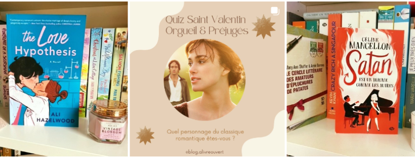 J'avais très envie de vous proposer un nouveau quiz littéraire de St Valentin. Mais après le succès de celui de l'année dernière consacré à Orgueil et Préjugés, difficile de faire mieux ! Il a donc fallu que je réfléchisse longtemps avant de trouver la solution. Et je ne suis pas peu fière de vous proposer … Lire la suite 😍📖Quiz littéraire : Qui sera le Valentin de votre soirée romantique idéale ?